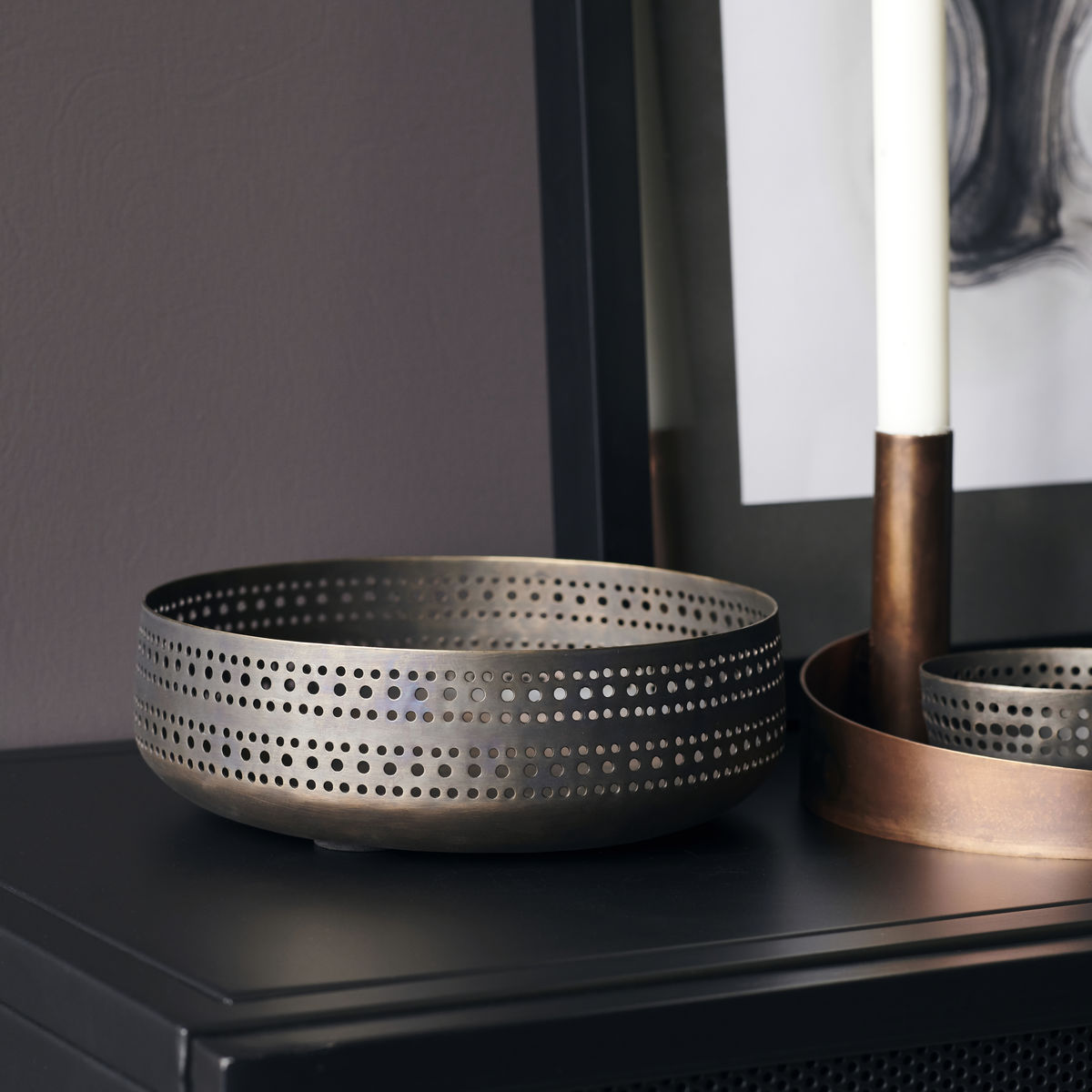 Stiilne metallist aukudega kauss kaunistab sinu lauda. Puuviljad või maiustused sobivad imeliselt sellesse mahukasse kaussi, brändilt House Doctor. Perfo kauss on valmistatud messingist ja viimistletud mati pruuni värviga. Väikesed augud lisavad kujule kergust ja õrna joont.