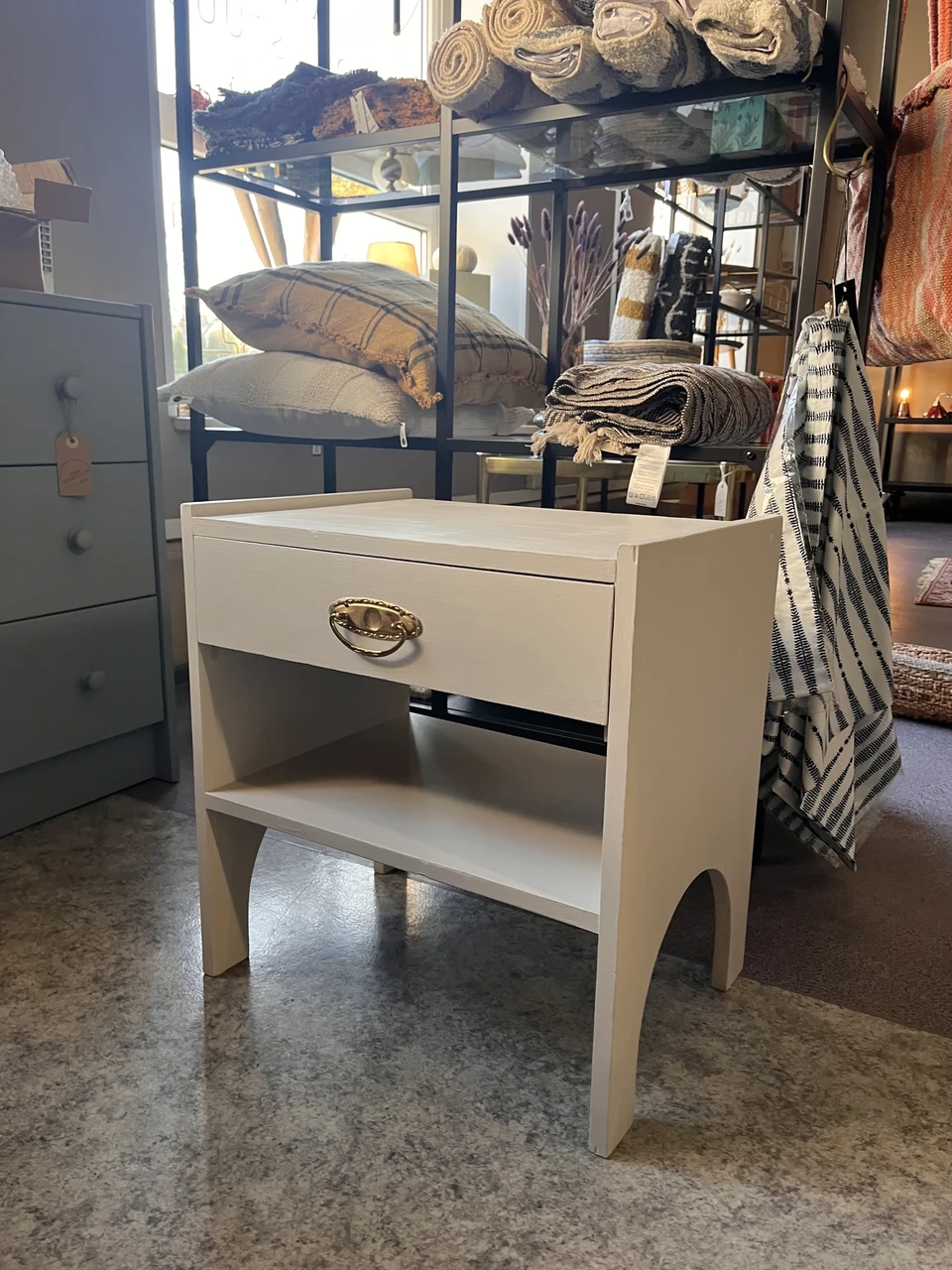 Kreemikat tooni hele puidust öökapp. Sellel on külgedel põnevad kaared ja üks sahtel armsa vanaaegse käepidemega. Öökappe olemas stuudios 1 tk.