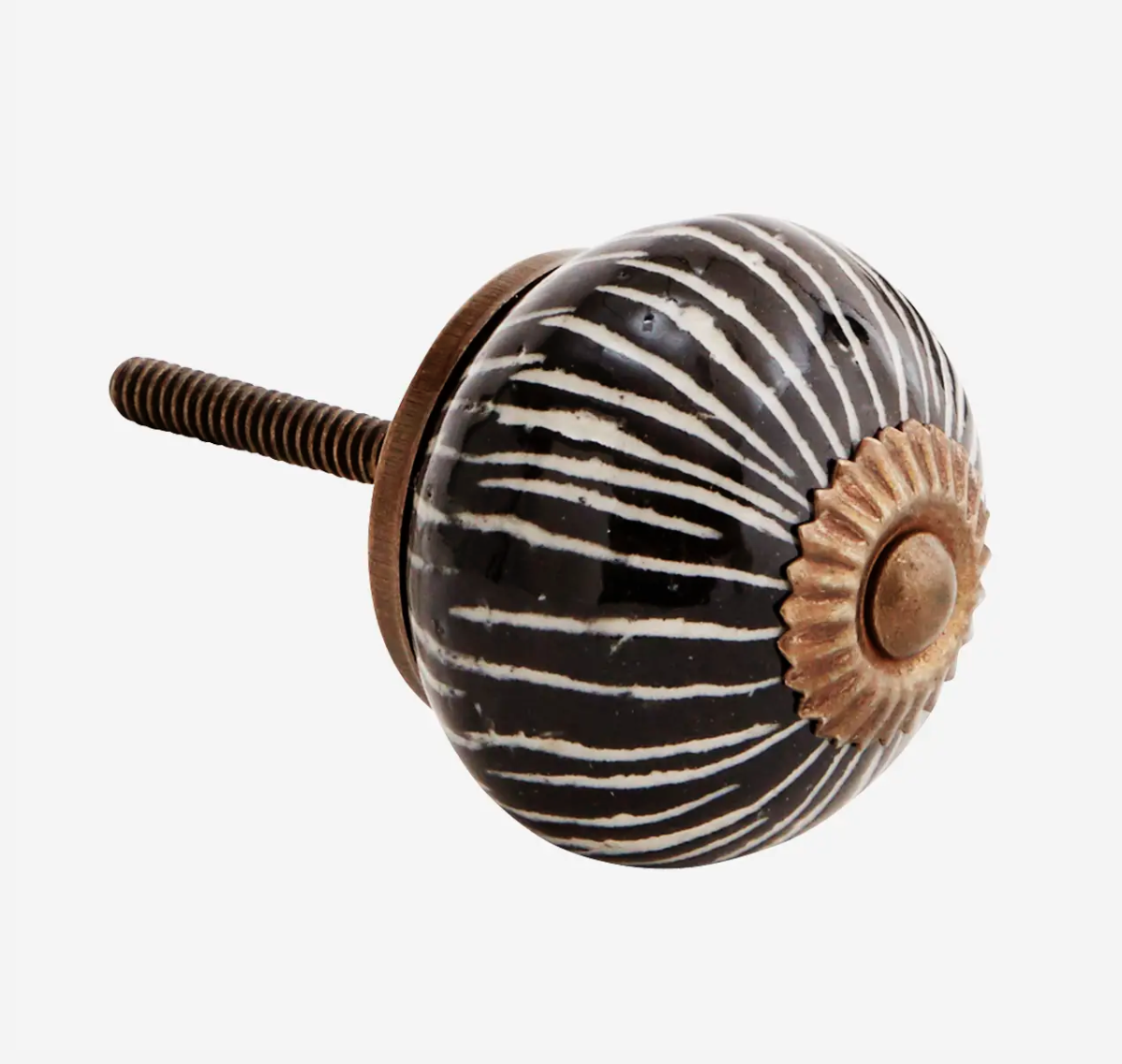 Käsitööna valminu keraamiline kapinupp Madam Stoltzilt. Põnev triibu muster.
