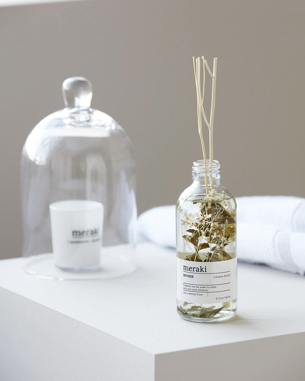 Rahustava ja kerge lõhnaga Meraki ruumilõhnastaja Verbena drizzle. Kodulõhnastaja on saadaval lihtsas dekoratiivses klaaspudelis, millel on oksakujulised puidust pulgad, mis levitavad mõnusat lõhna teie tuppa, lõhnastaja pole liiga tugeva aroomiga. Kasutage lõhnastajat näiteks oma vannitoas, asetage see riiulile koos teiste dekoratiivelementidega stiilse koosluse loomiseks.