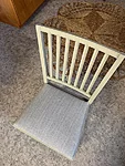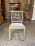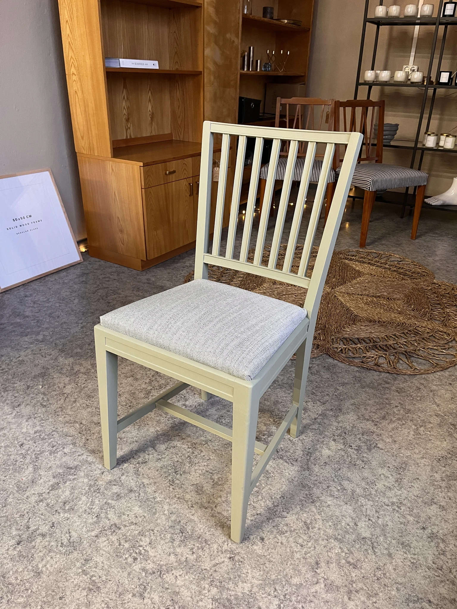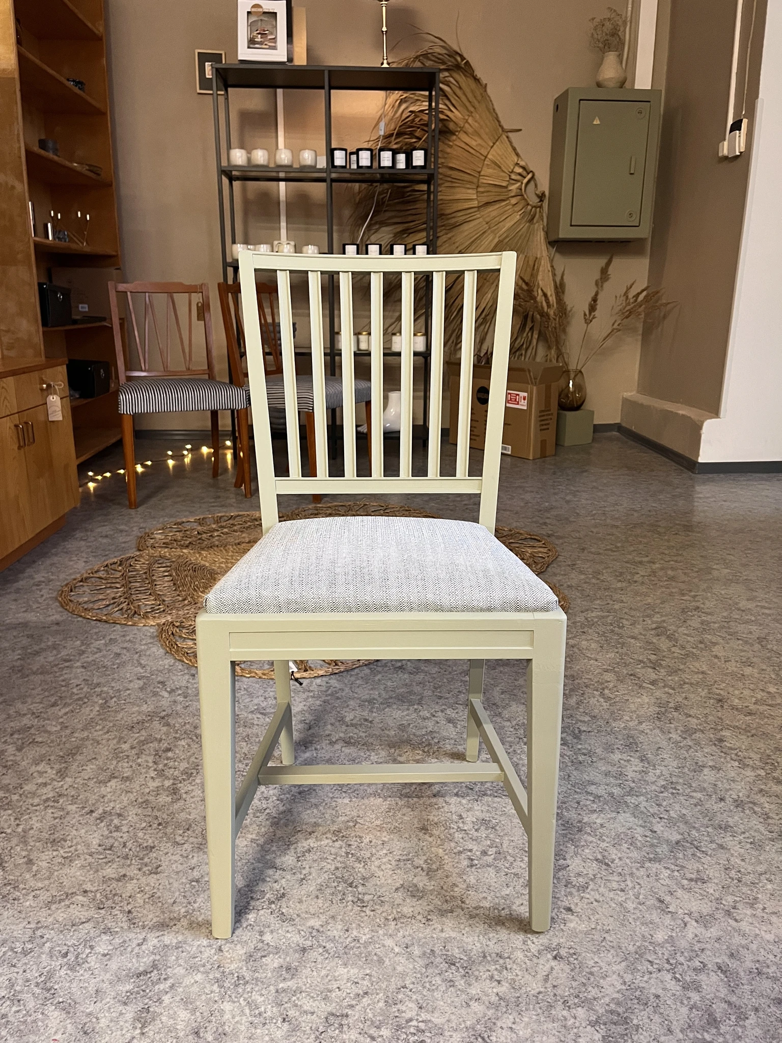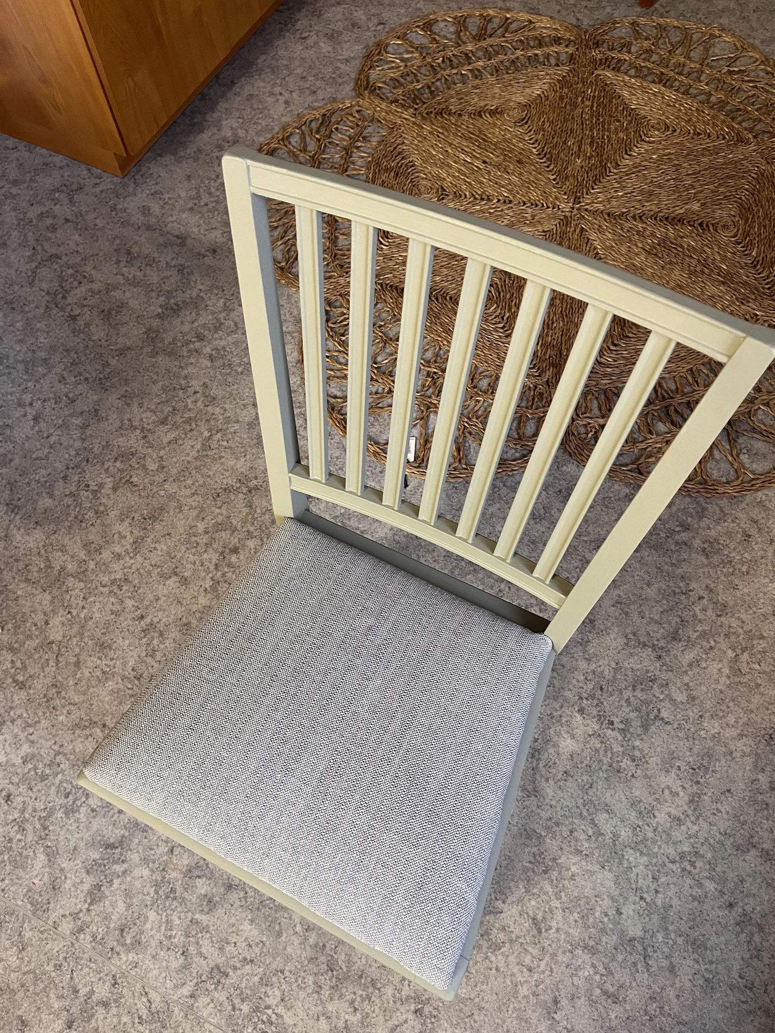Puidust tool on värvitud üle hallikas roheka tooniga, vahetatud on ka tooli kangas.