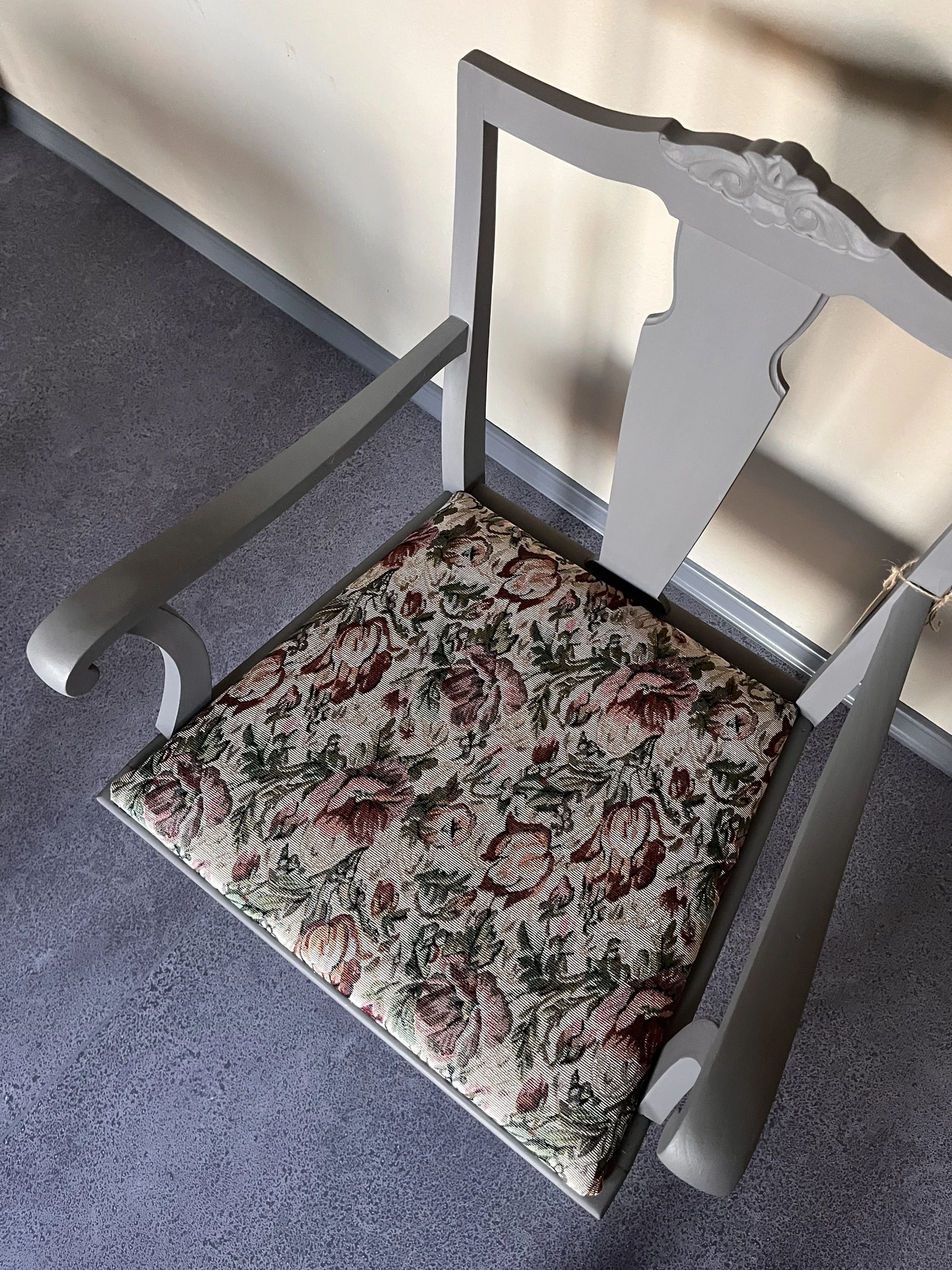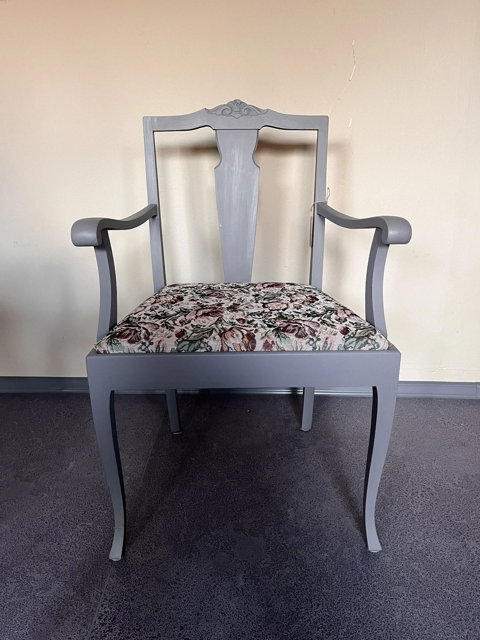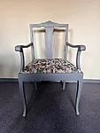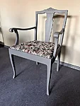 Lillekangaga värvitud käetugedega tool on stuudios ootamas. Midagi veidi romantilist ja Skandinaavialikus stiilis. Puidust raam on värvitud lillakashalli mineraalvärvi tooniga. Kangas vahetatud. Tool lisab mõnusat meeleolu ruumis.