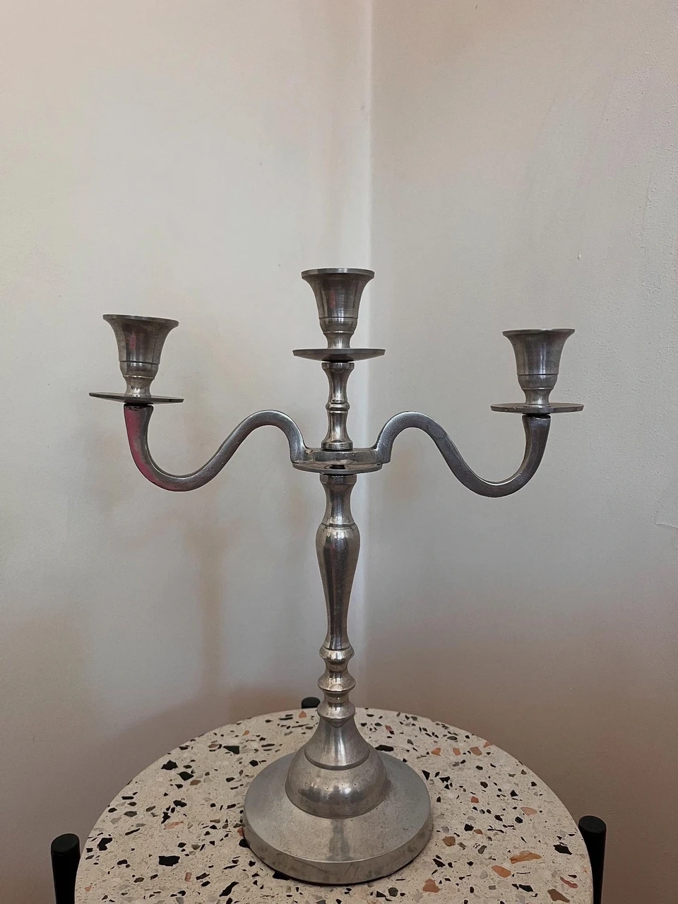 Kaunis antiik stiilis küünlajalg paatina efektiga 3 küünla jaoks. Lauahõbedast ja sobib kaunilt pidulikuma meeleolu loomiseks. Sobivad tavamõõdus pikad küünlad. Heas vintage seisukorras.