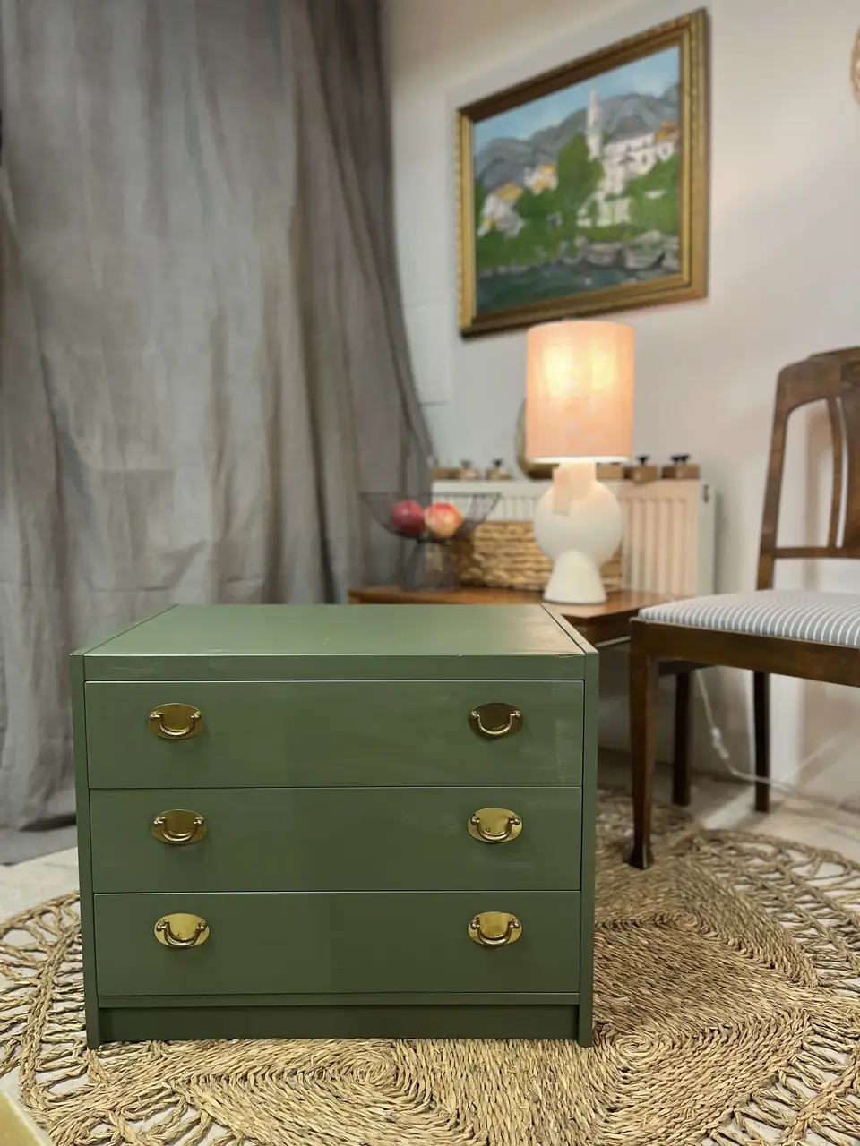 Roheline väike kummut / öökapp on üle värvitud kahes kihis. Kummutil kenad kuldsed käepidemed. Stiilne kummut on igas ruumis dekoratiivne.