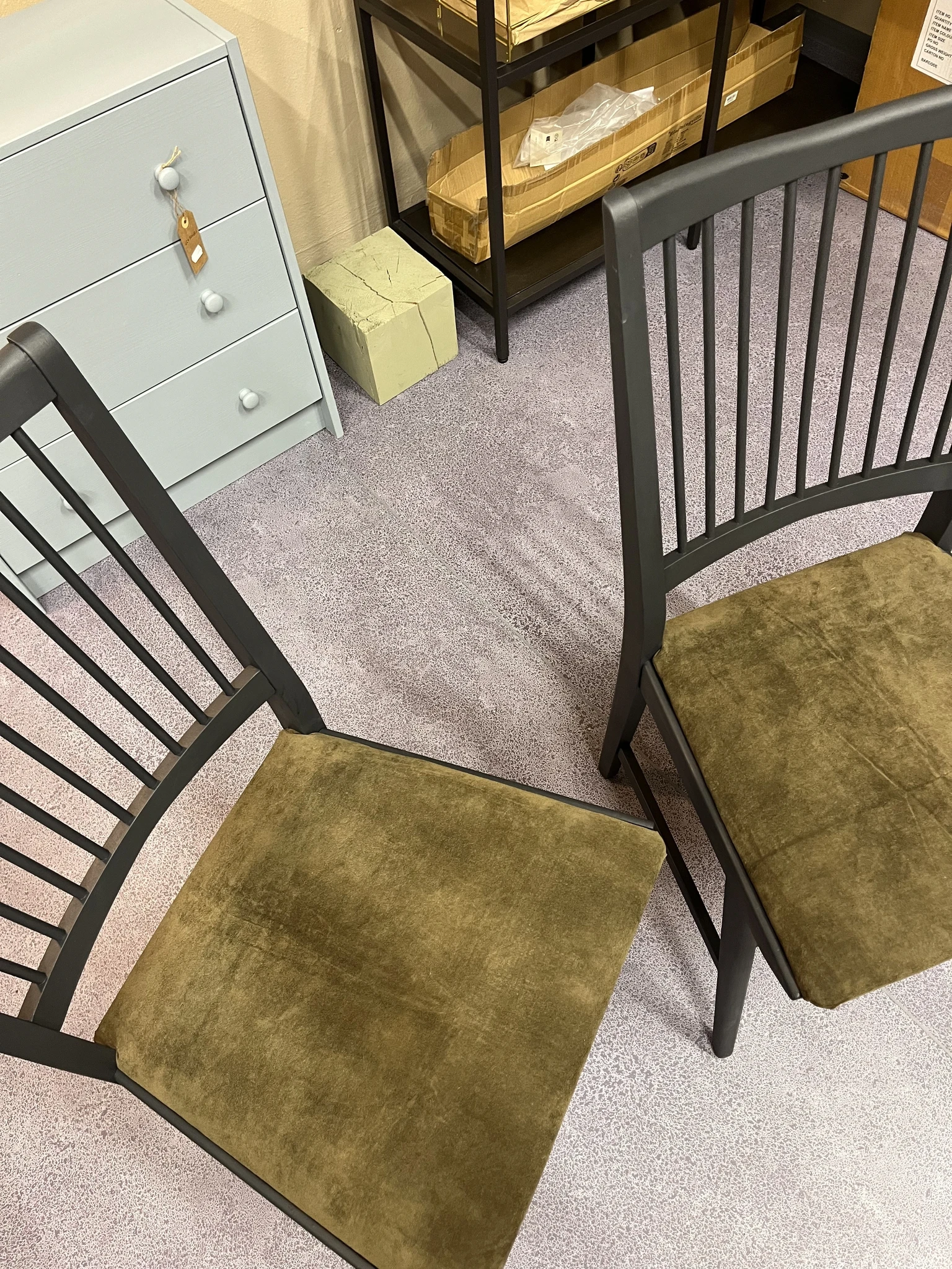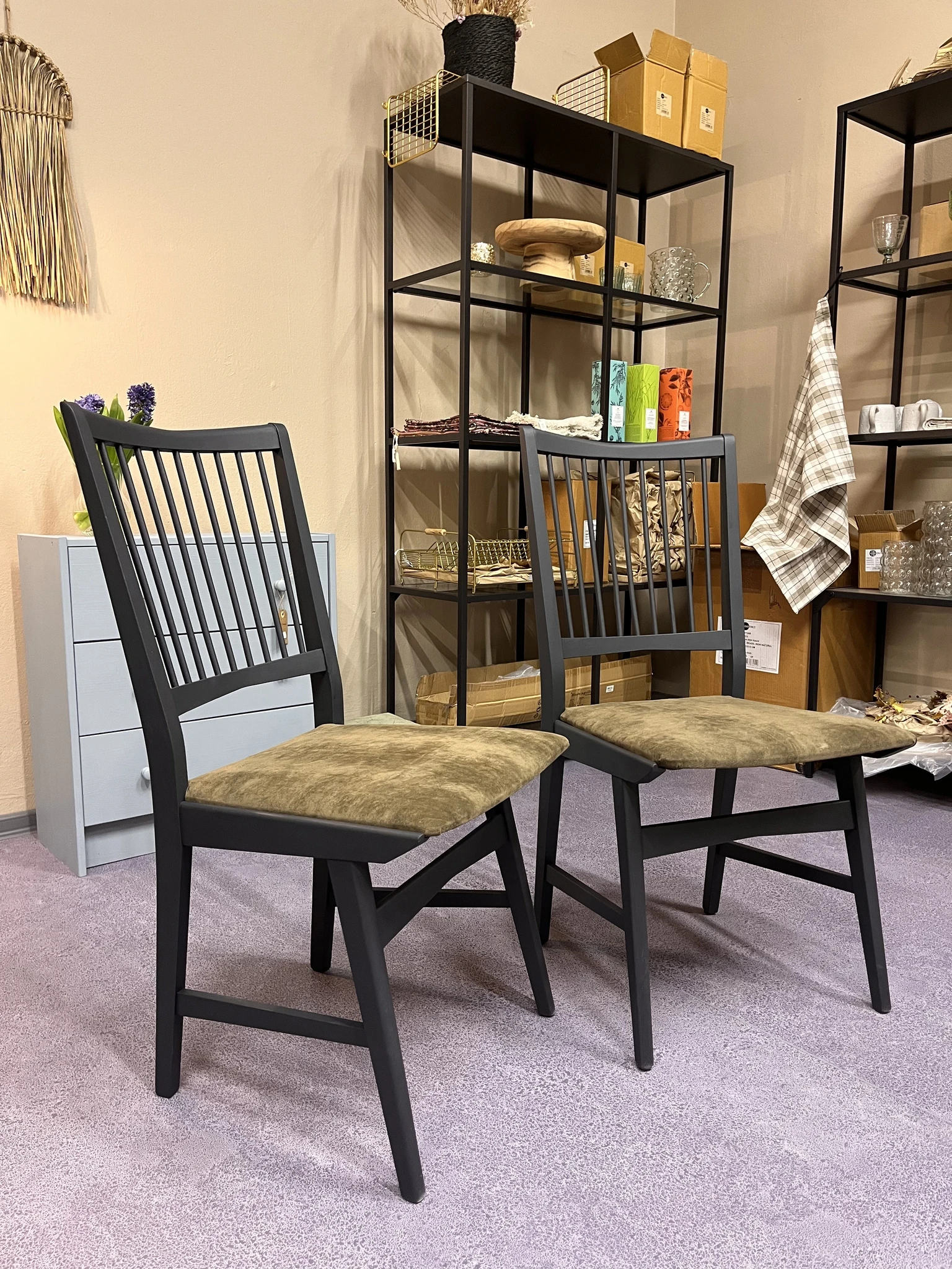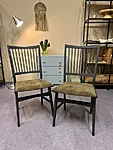 Värvitud mustjad pulgatoolid. Värvitud mineraalvärviga kahes kihis, katteriie vahetatud. Sametine rohekas kangas ja mustjad värvitud pind tekitavad ilusa kontrasti. Toole komplektis 2 tk.
