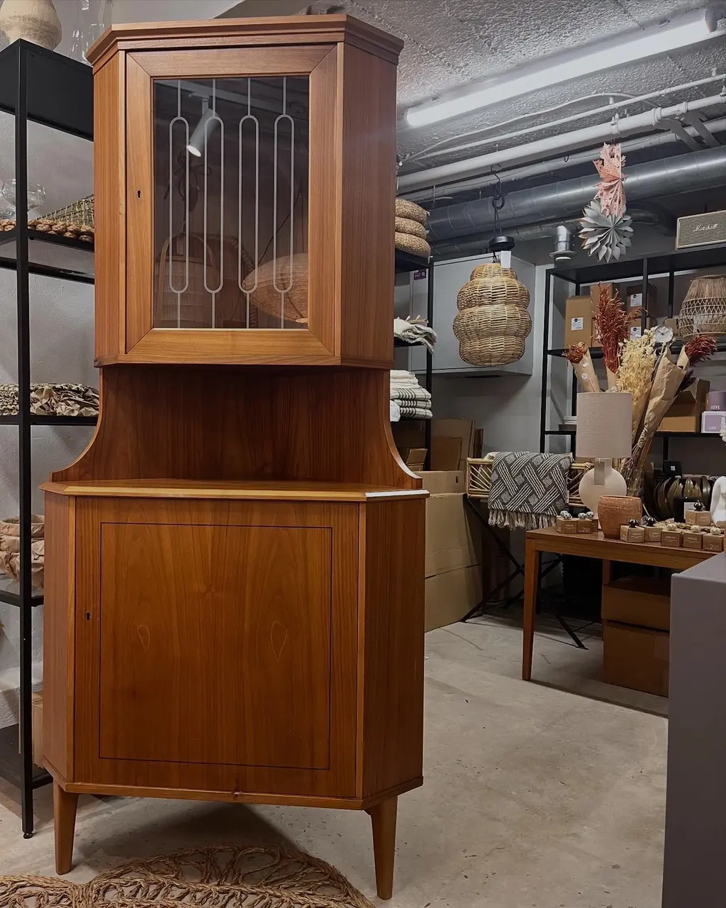 Stiilne nurgakapp põneva mustrilise klaasiga. Nurgakapp on nägus ja praktiline mööbliese, nii maamajas kui ka veel enam linnas, sest aitab Sul kasutada nurga ruumi optimaalselt, hoiab asjad peidus ning on suurepärane panipaik. Tiikpuu spoon on vahatatud üle ning uksed käivad kenasti lukku.