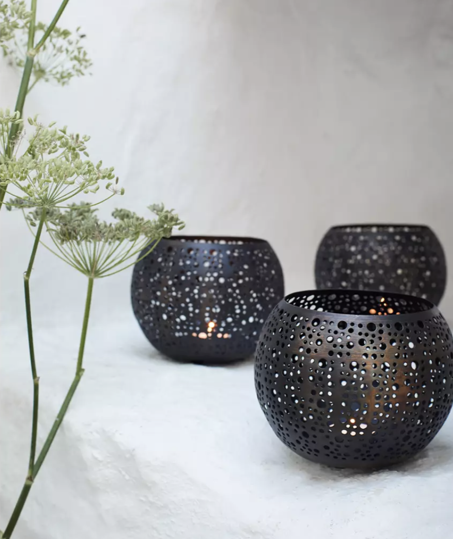 Ümmargune metallist küünlahoidja brändilt Madam Stoltz. Auguline muster tekitab põneva efekti, sisse sobivad tavalised teeküünlad.