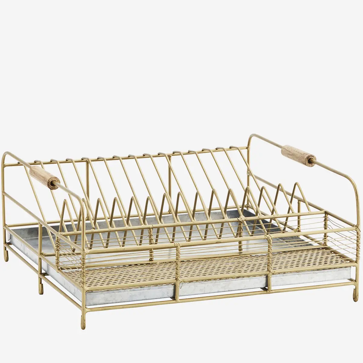 Metallist messing tooni nõude kuivatusrest Madam Stoltzilt. Puidust käepidemed lisavad kauni detaili. Ka nõuderest võib olla köögis dekoratiivne ja kaunis ese.