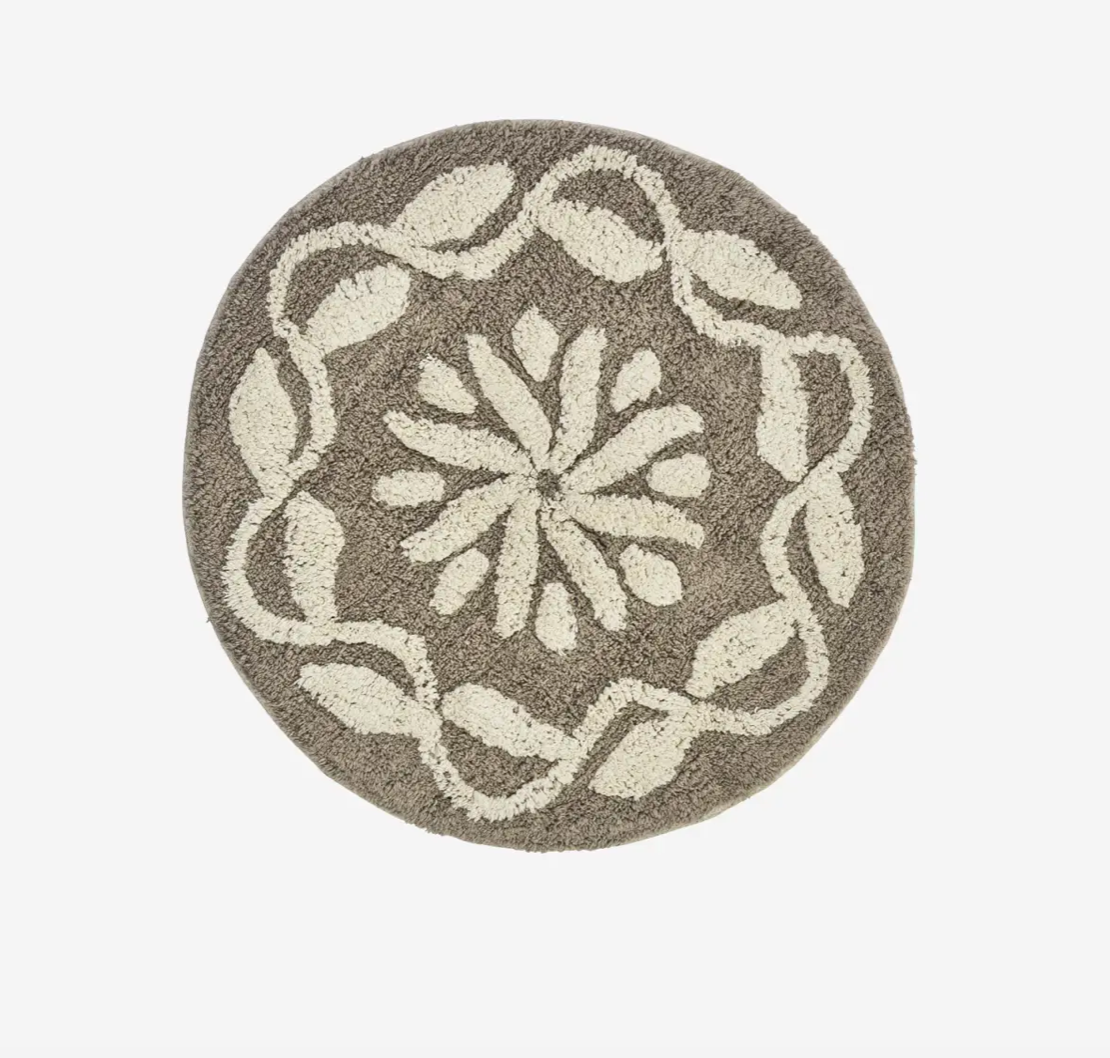 Ümmargune puuvillane tuftitud vannitoa vaip Madam Stoltzilt AW25 kollektsioonist. Kauni ornamendi mustriga vaip vannituppa, vaiba alumisel küljel lateks kiht, mis tagab parema paigal püsimise.