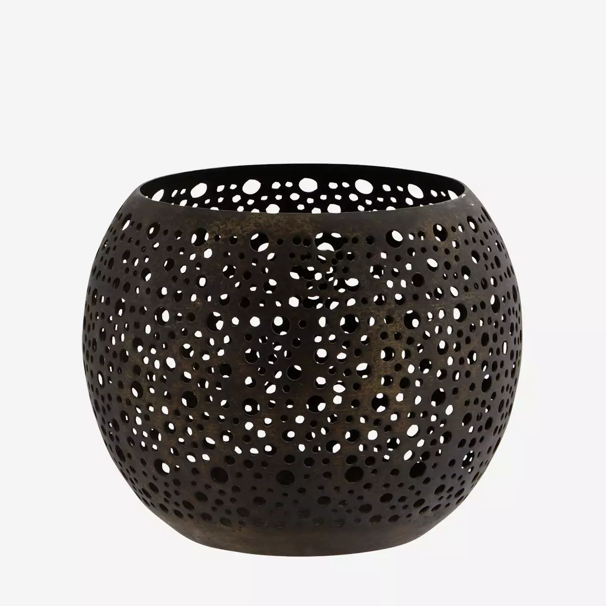 Ümmargune metallist küünlahoidja brändilt Madam Stoltz. Auguline muster tekitab põneva efekti, sisse sobivad tavalised teeküünlad.
