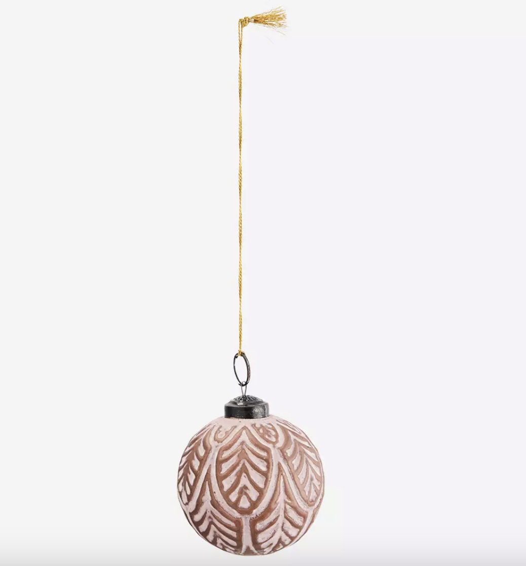 Klaasist mustriline vanaroosa ja vase tooni jõuluehe Madam Stoltzilt. Ilus messingist kinnitusrõngas ja pael koos väikese dekoratiivse tutiga.