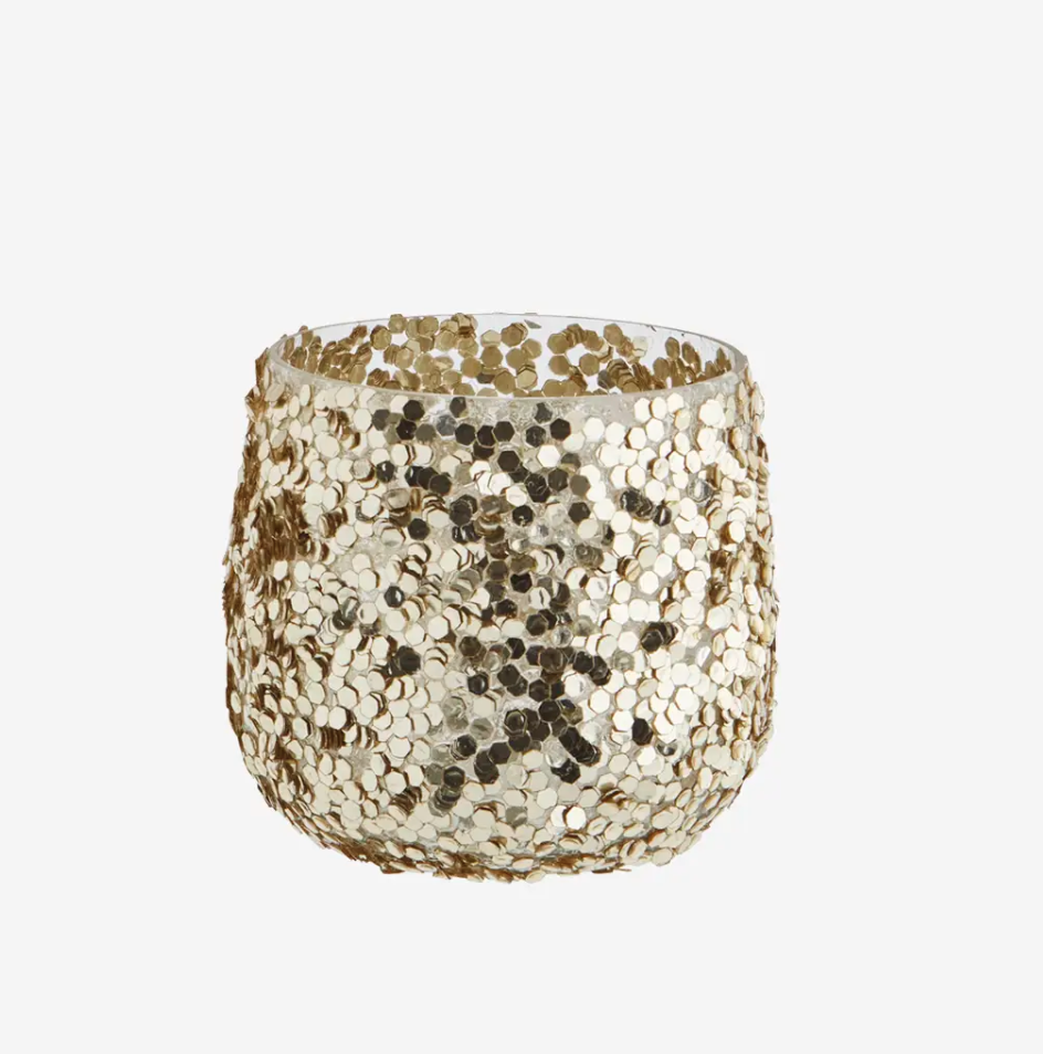 Kuldselt sädelev klaasist küünlavaas on kaetud litritega. See paneb särama ruumi ja annab pidulikku meleolu. Küünlavaasis saad põletada teeküünlaid.