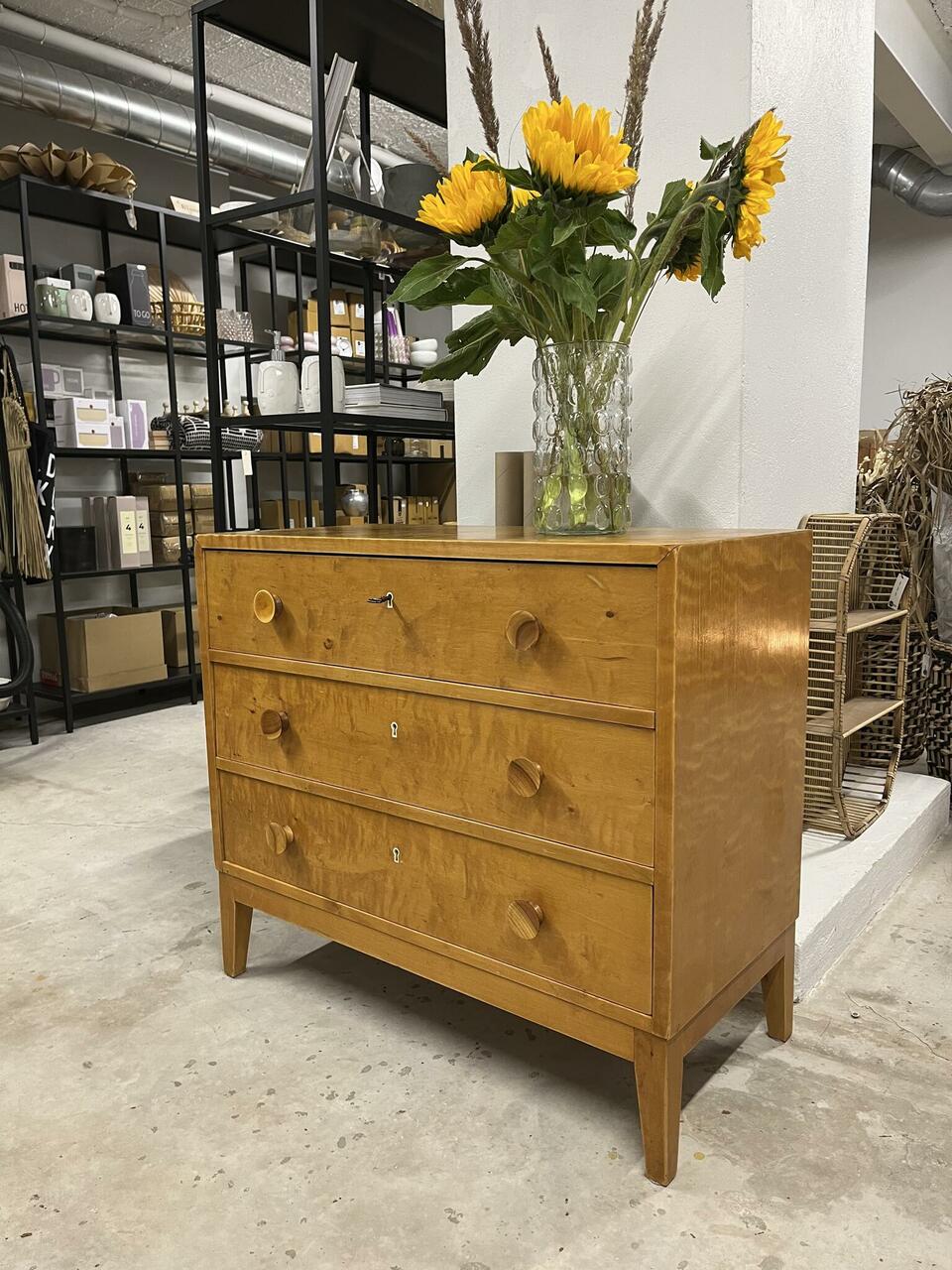 Puidust kummut on 3 sahtliga. Pind on kaetud maarjakase spooniga, osaliselt näha kulumisjälgi. Kummut on väga ilusa kujuga ja puidust nuppudega. Viimistlus on üle värskendatud mööblivahaga, väga naturaalne ja ehe mööbliese Sinu ruumi. Olemas ka võti.
