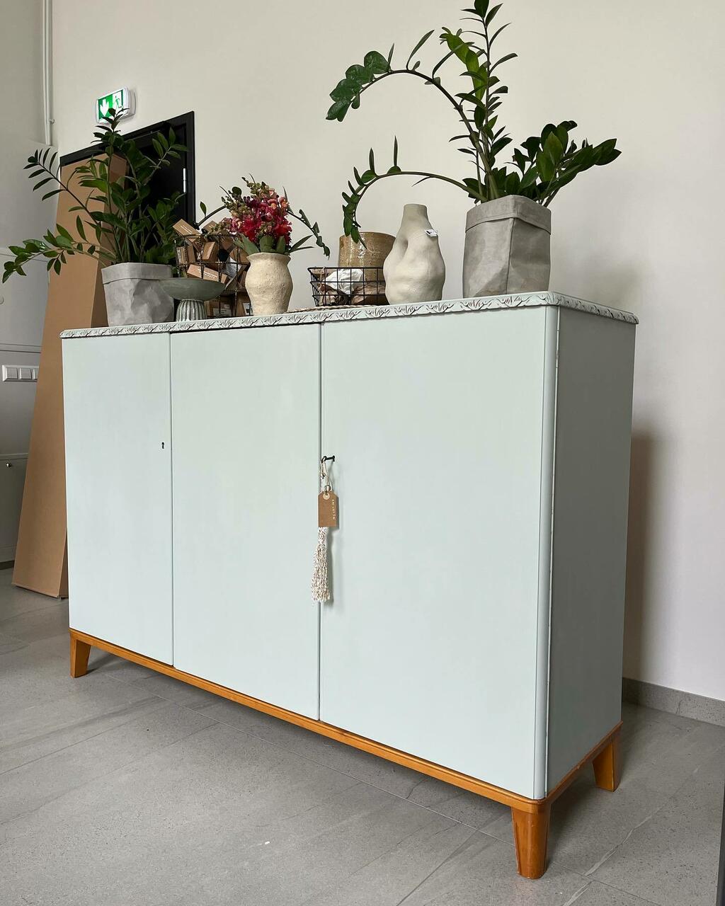 Kaunis dekoreeritud servaga värvitud vintage kapp. Sees kaks väiksemat sahtlit ja riiulid, väga mahukas ja hea panipaik. Võimalik kasutada riidekapina, pesukapina, nõudekapina vms, väga mitmekülgne ning ajatu mööbliese. Värvitud osaliselt, kahes kihis tooniga Lera (kergelt sinakashallikas toon). Kapp on väga korralikus seisus, võti on olemas ja keerab ka lukku.